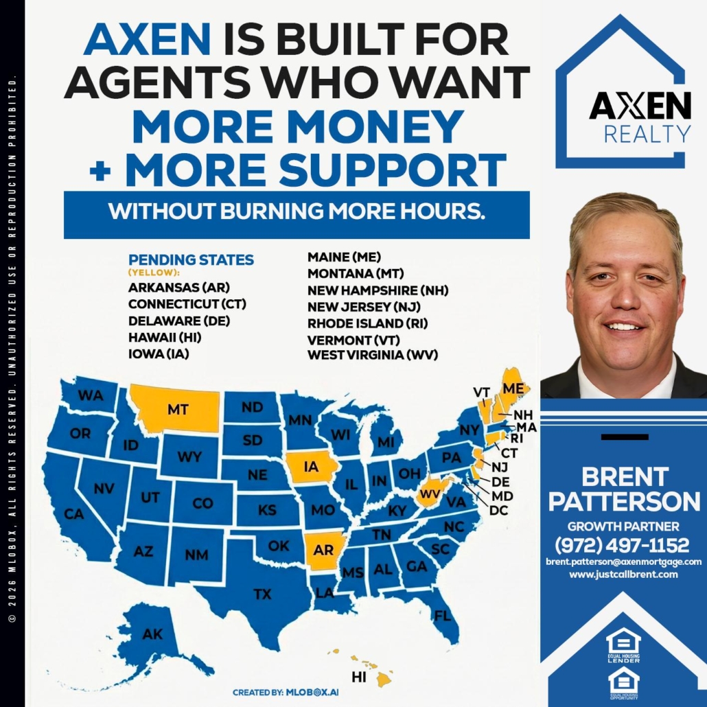 AXEN IS BUILT FOR AGENTS - Brent Patterson -Loan OfficerHi, my name is Brent Patterson. I’m a Loan Officer with justcallbrent, offering personalized mortgage solutions, fast customized quotes, great rates and service with integrity.