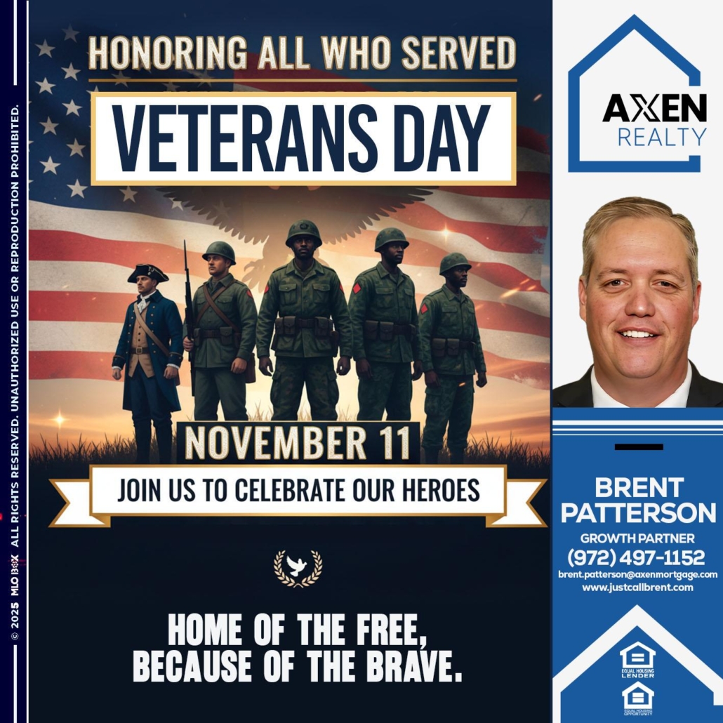 VETERANS DAY - Brent Patterson -Loan OfficerHi, my name is Brent Patterson. I’m a Loan Officer with AXEN Mortgage LLC., offering personalized mortgage solutions, fast customized quotes, great rates and service with integrity.